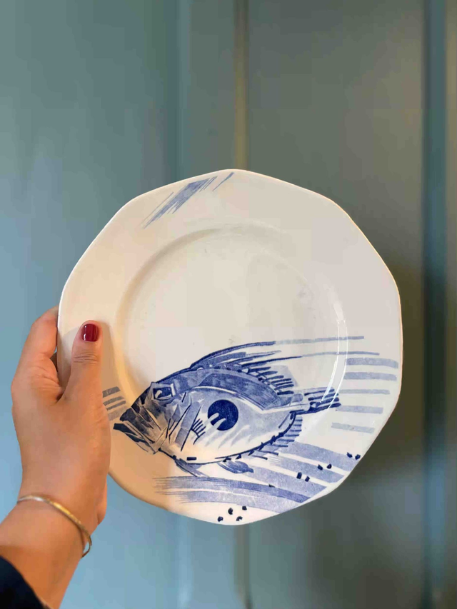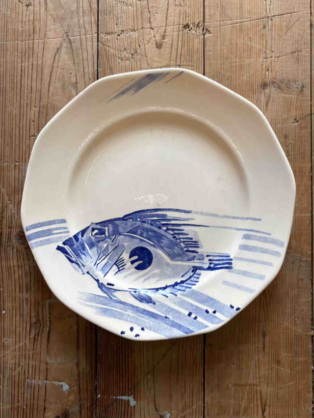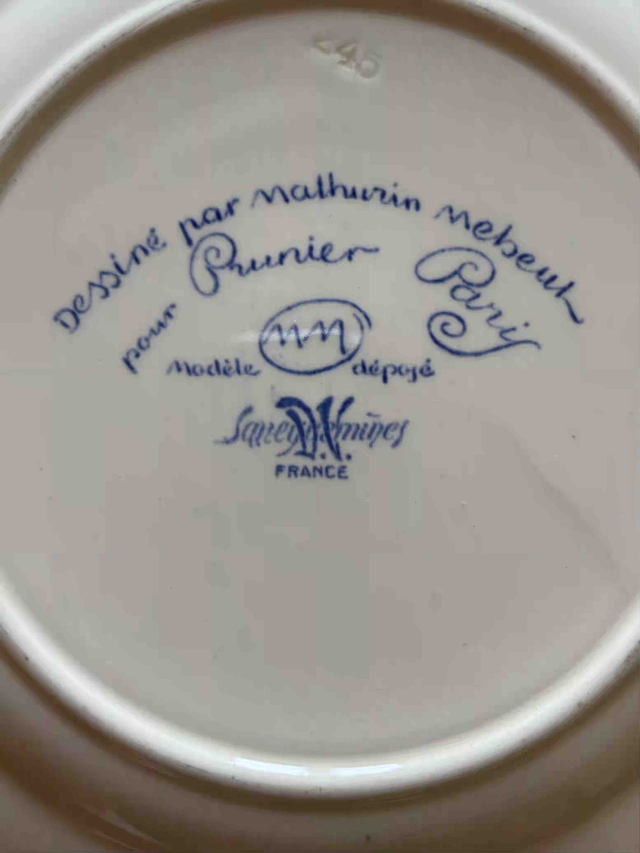 Assiette décagonale Braunschweig de Villeroy & Boch (diamètre 24 cm), mention « Dessiné par Mathurin Méheut pour Prunier Paris » et monogramme « MM ».